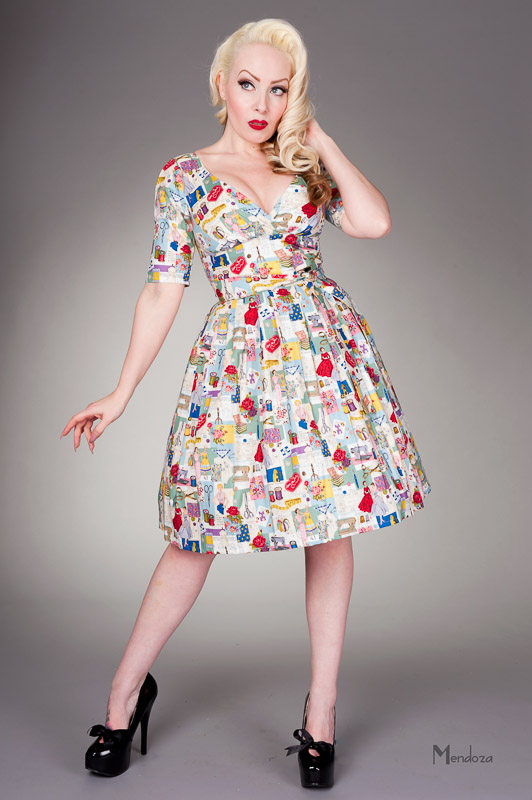 1950s STYLE RETRO DRESS.THE STYLE IS A DAY DRESS, PRINT LOVE TO SEW 100% COTTON SIZE 12 IN STOCK. YOU CAN PICK AND ORDER YOUR OWN STYLE,SIZE AND PRINT.